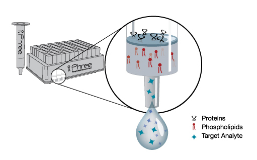 The simplest solution to this issue is to use a sample preparation product which allows for the simultaneous precipitation of plasma proteins whilst removing phospholipids from the resulting supernatant. Such products consist of tubes or 96-well plates that have membranes to remove precipitated proteins, and a sorbent to retain phospholipids. Samples are mixed with a precipitating solution, such as methanol or acetonitrile, before being pulled down through the filter plate and sorbent bed. The resulting samples are then free of both protein and phospholipids enabling reliable quantitation and improved column lifetime. Fig 3: Phospholipid removal using Phree™